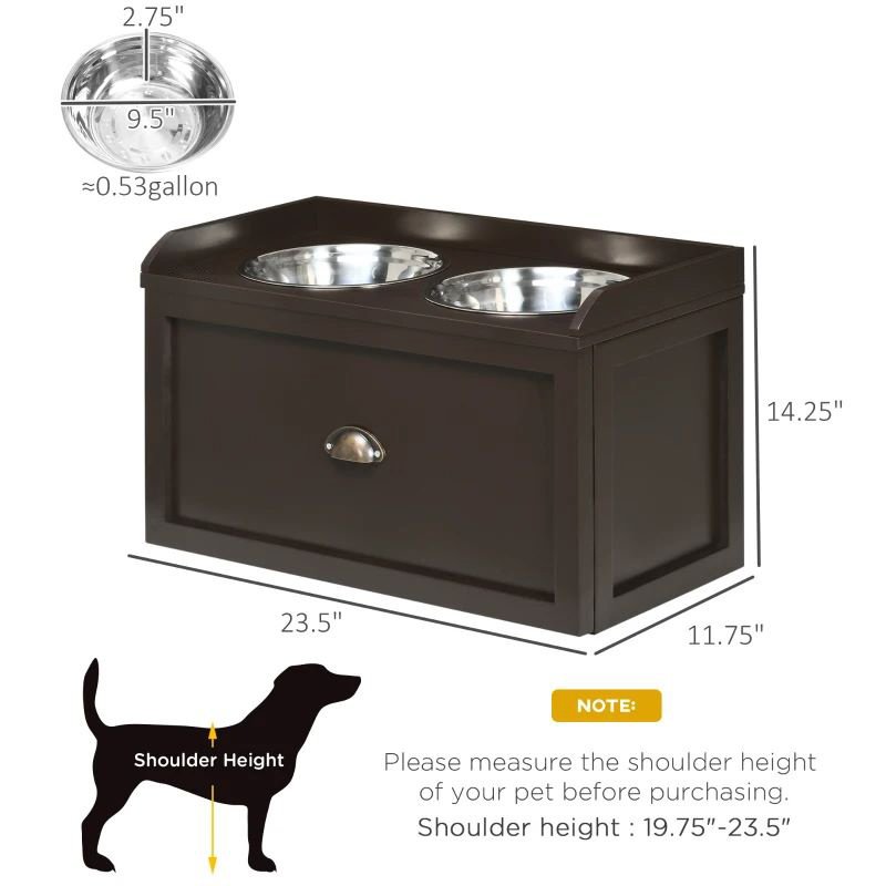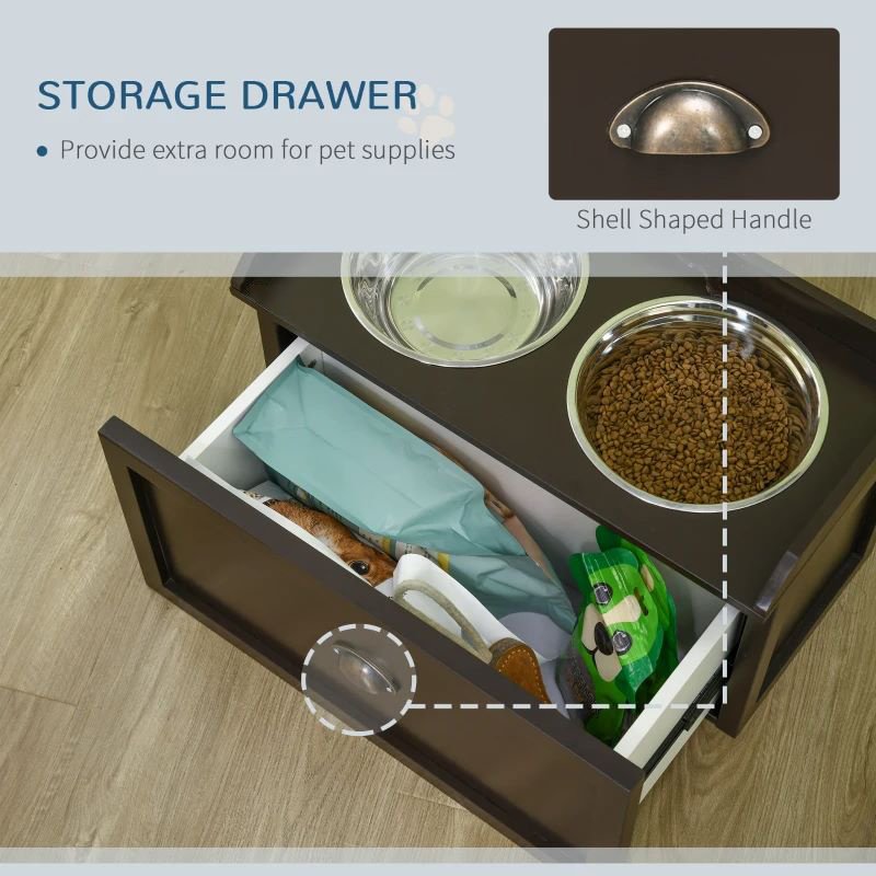 Large drawer for keeping everything under the food and water bowls, saving space.